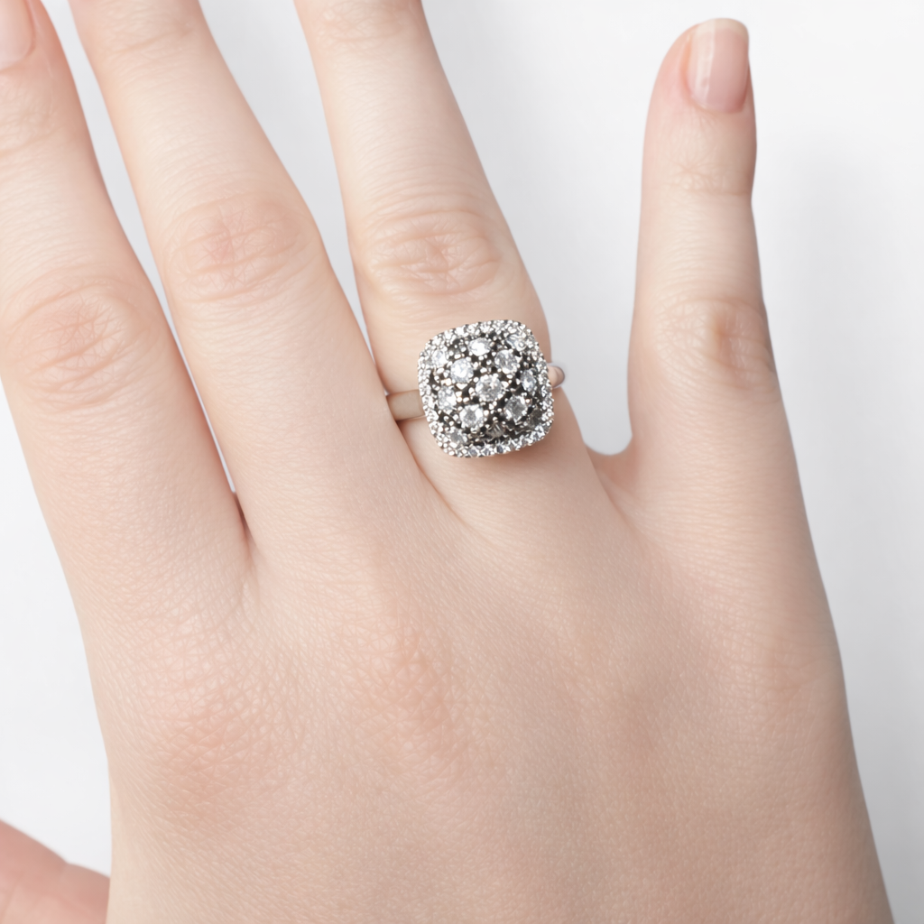A bold and dimensional design, this 18 karat white gold ring showcases a striking arrangement of black and colorless diamonds in a cushion-shaped cluster.