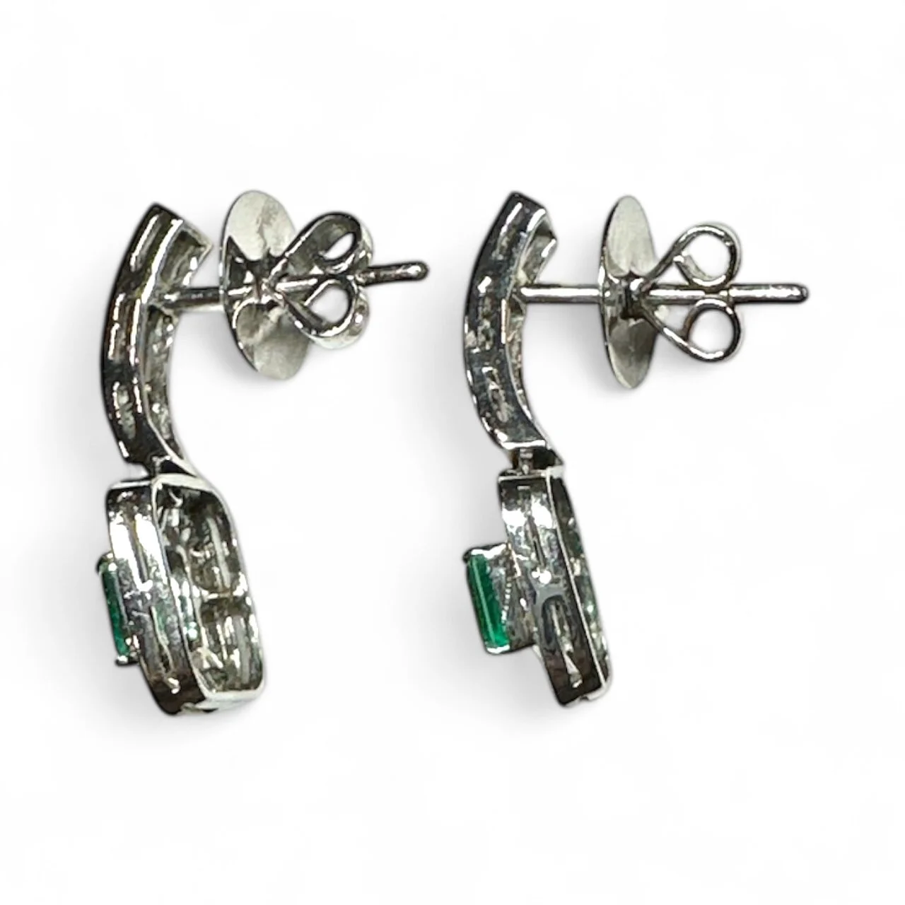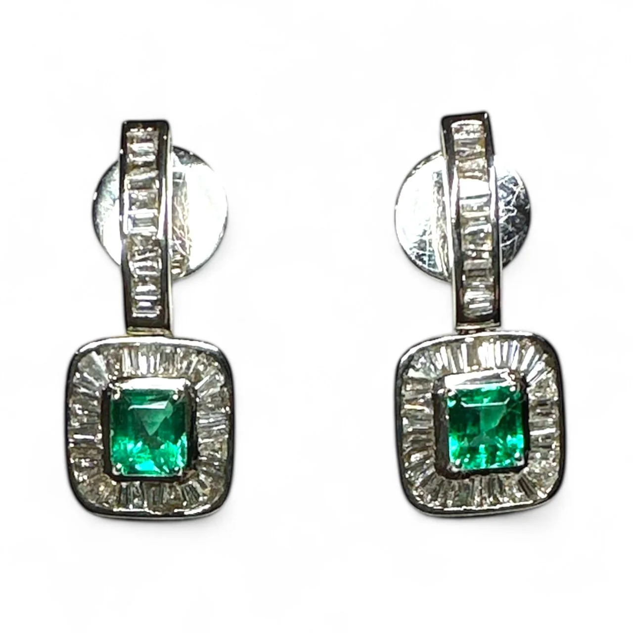 These elegant pre-owned drop earrings feature approximately 1.00 carat of vibrant emeralds surrounded by a halo of baguette diamonds.