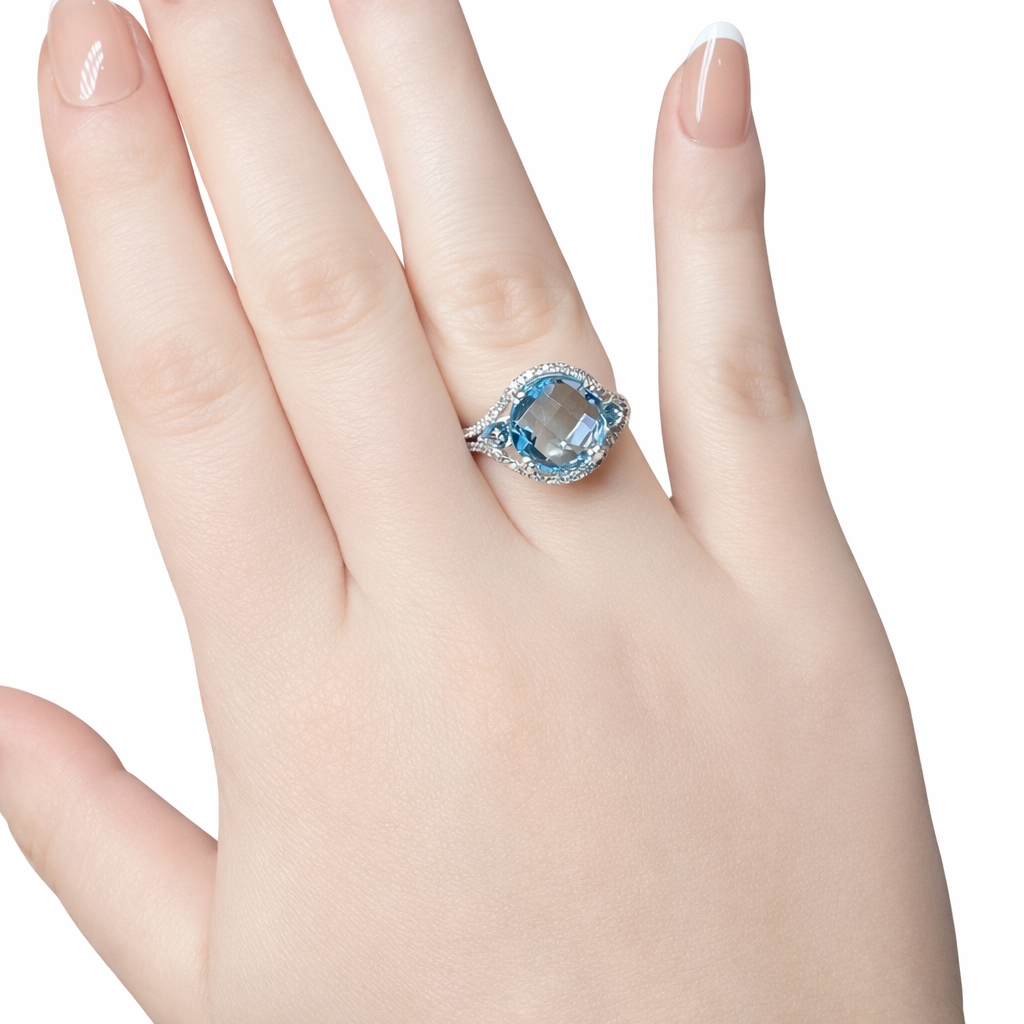 • Center stone: Blue topaz, checkerboard faceted