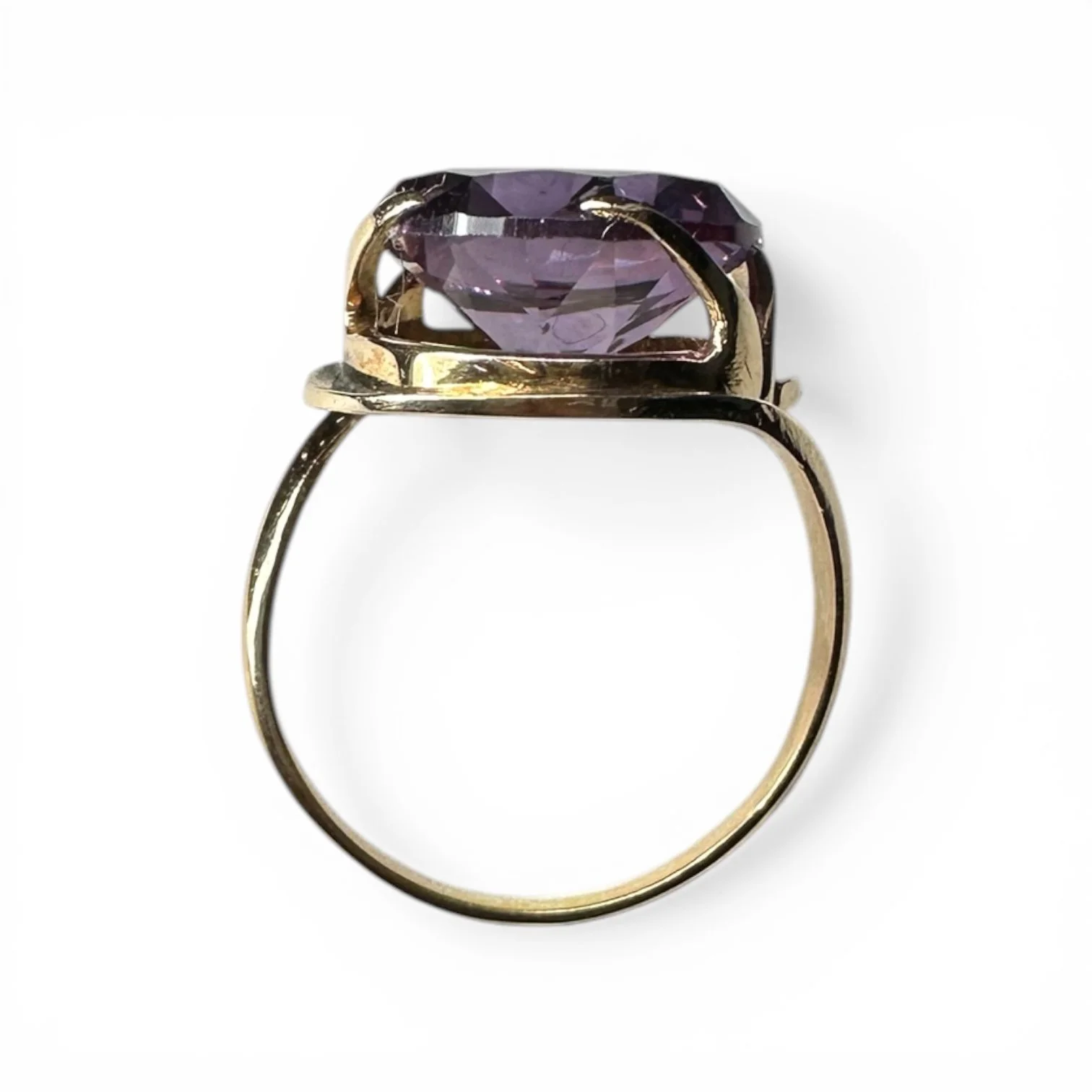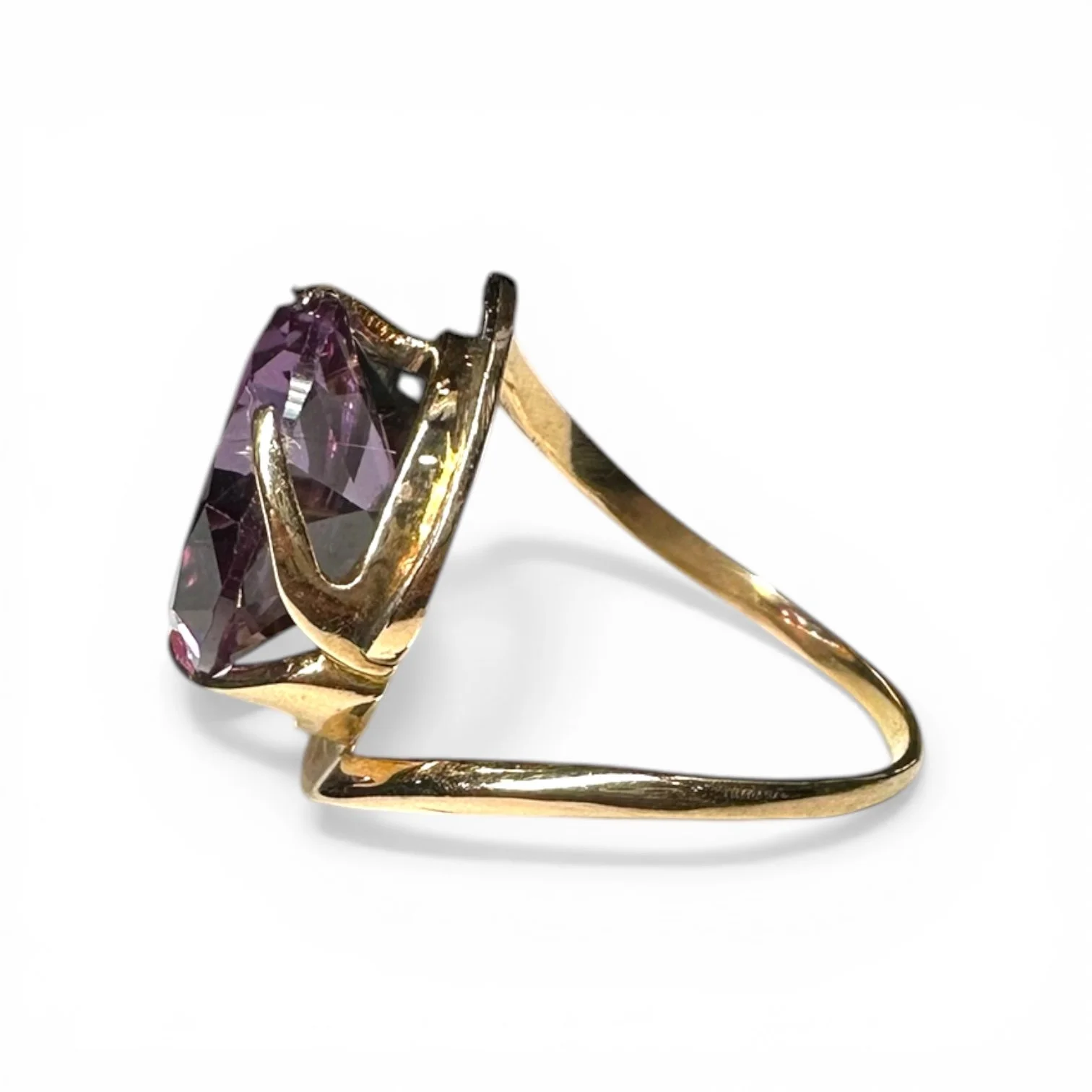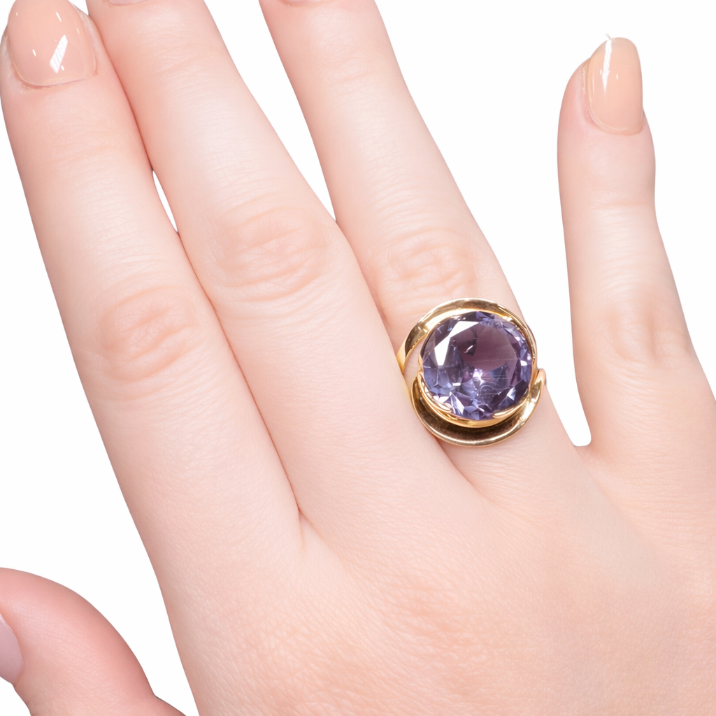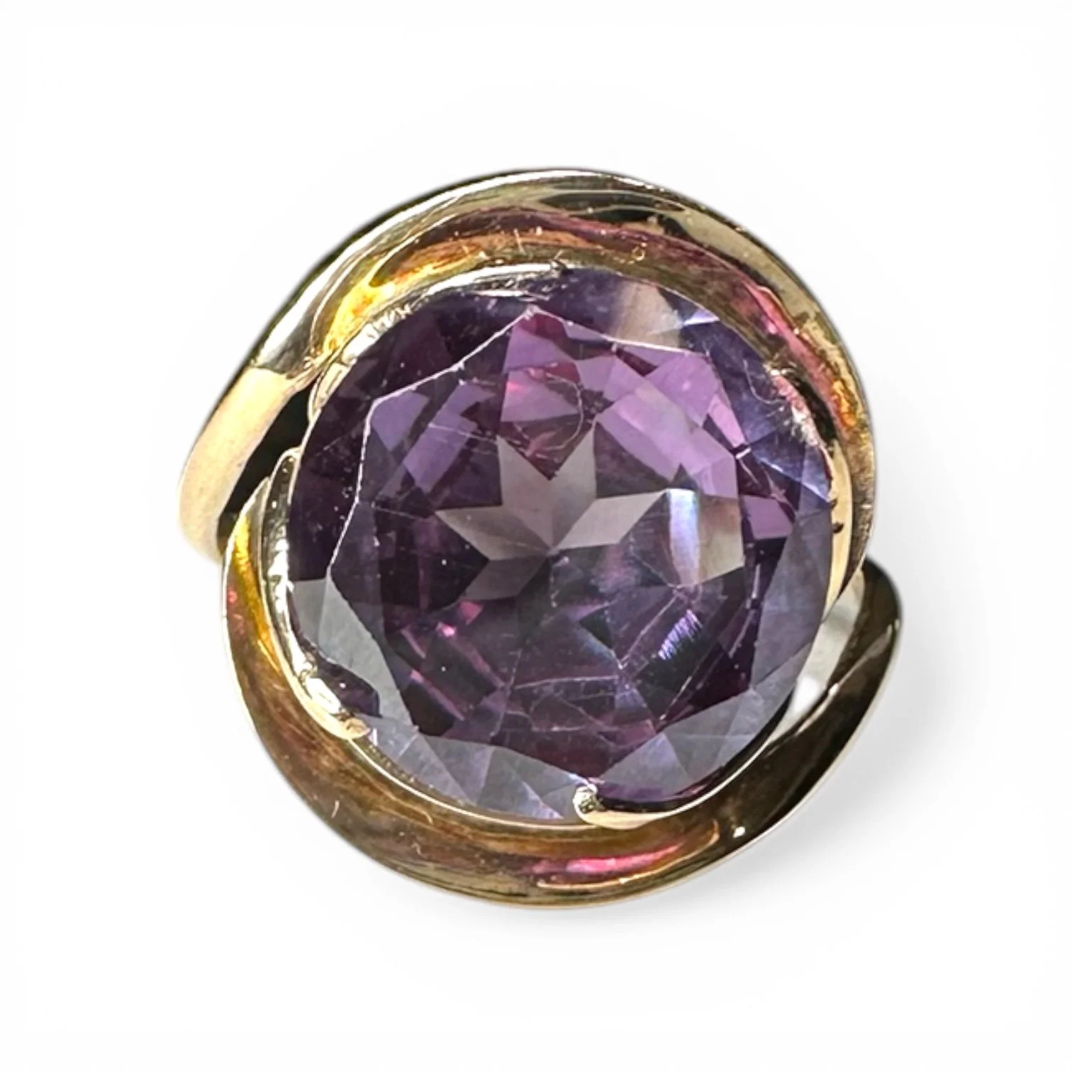 A distinctive vintage statement ring crafted in 14 karat rose gold, featuring a vivid synthetic color change sapphire in a sculptural bypass design. The round faceted center stone displays a captivating shift in color depending on lighting conditions, offering dynamic visual interest and depth.