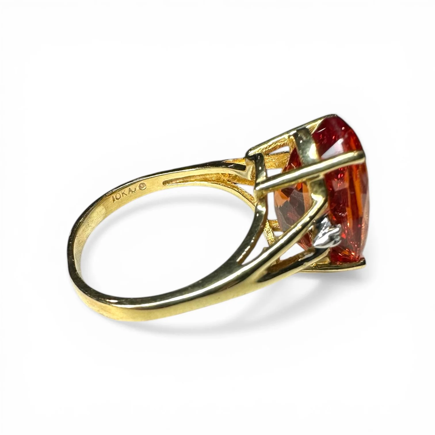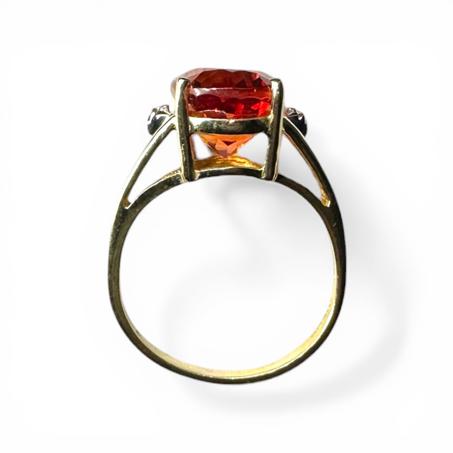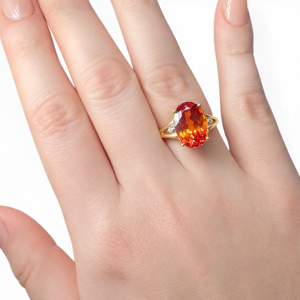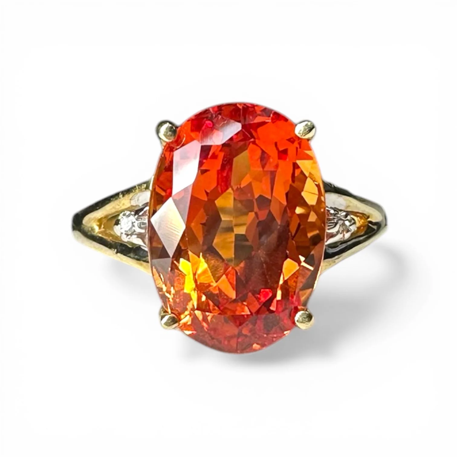 A vibrant and eye-catching ring showcasing a richly saturated synthetic orange sapphire. The oval-cut center stone is beautifully faceted, creating lively brilliance and depth.