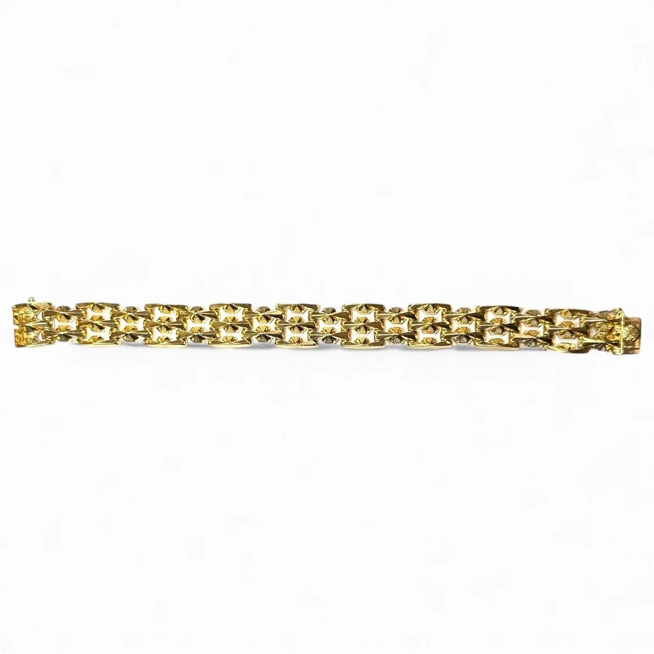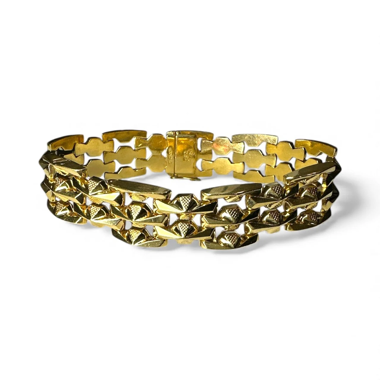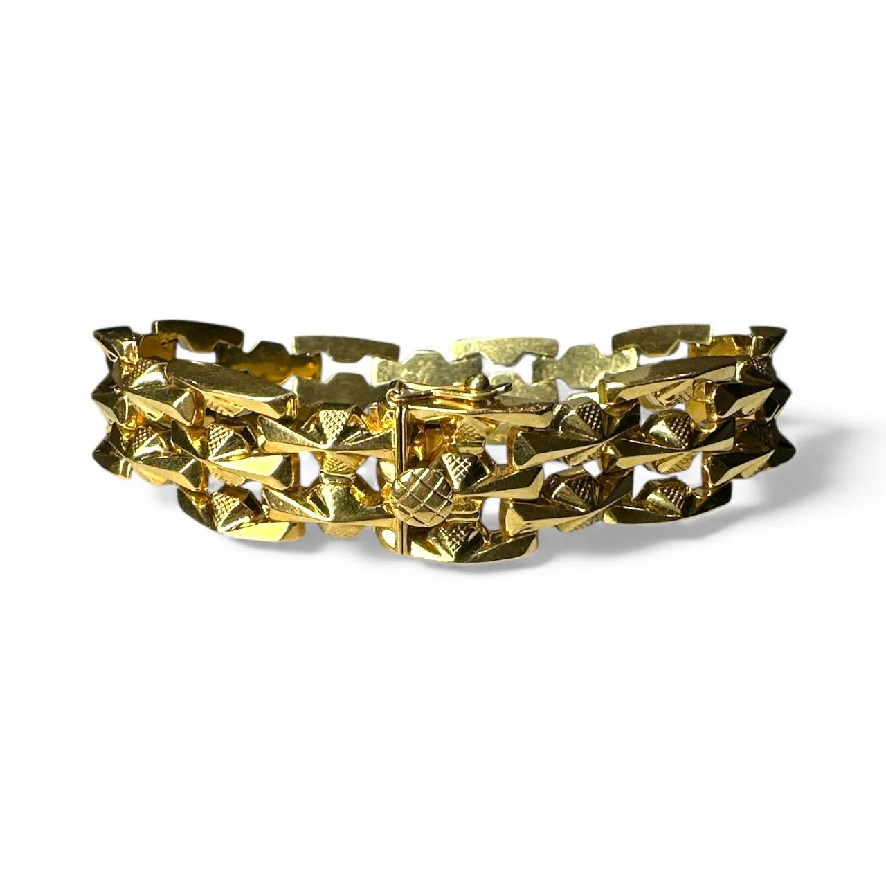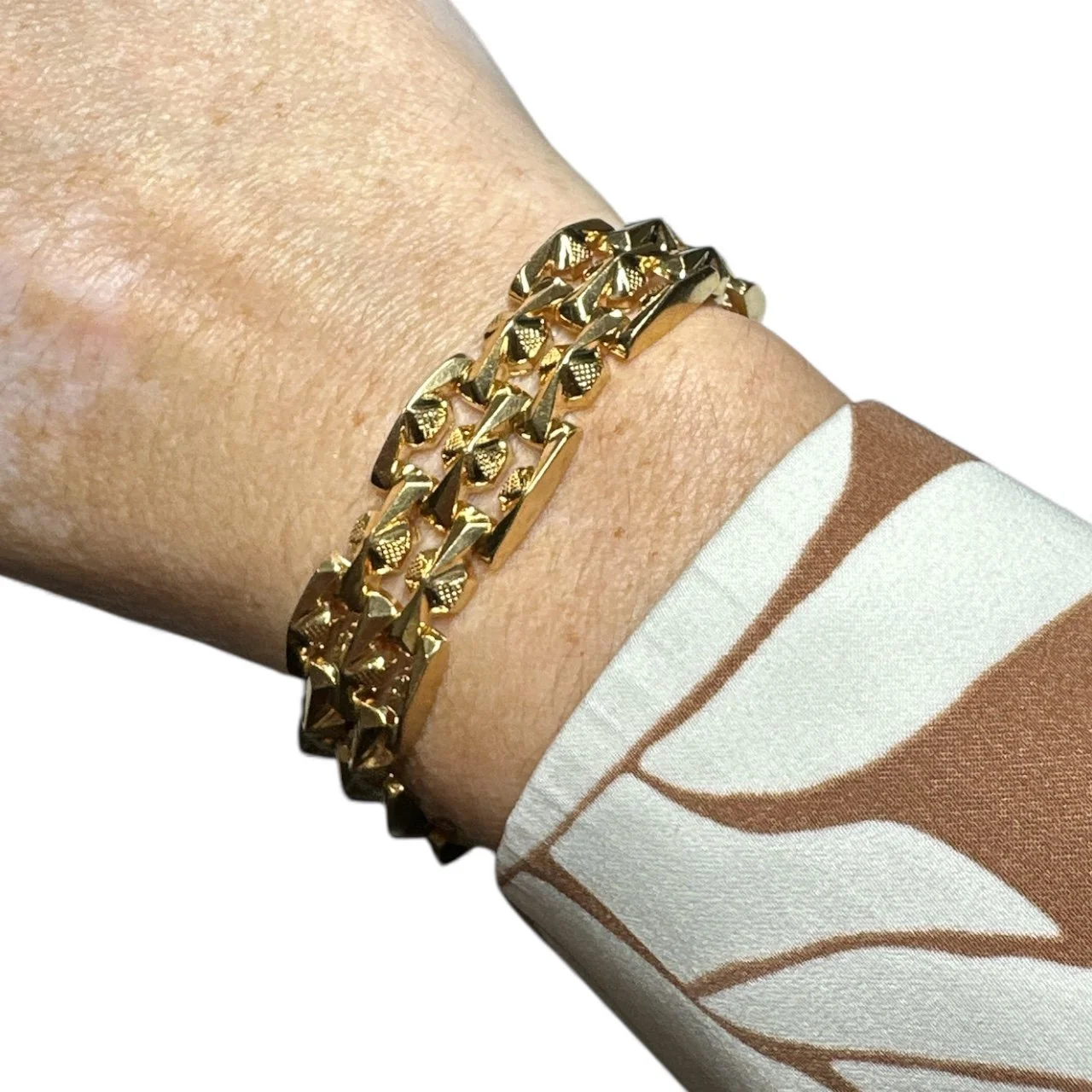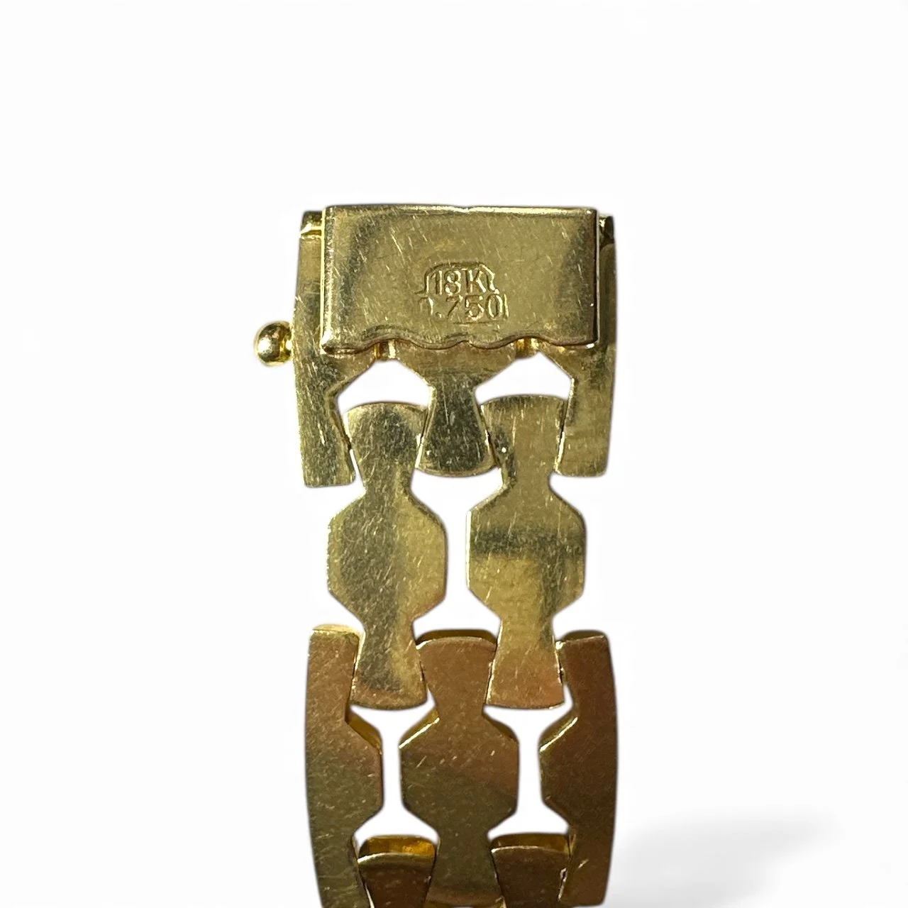 This vintage bracelet is crafted in rich 18K yellow gold and showcases an intricate, dimensional link pattern that reflects light beautifully from every angle. The design features alternating high-polish and textured elements, giving the piece exceptional visual interest and a luxurious feel.