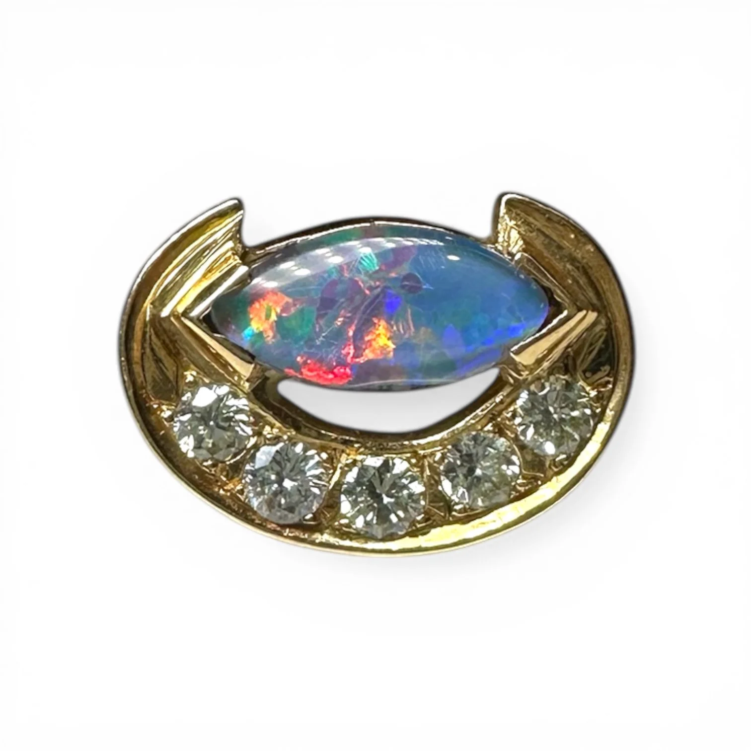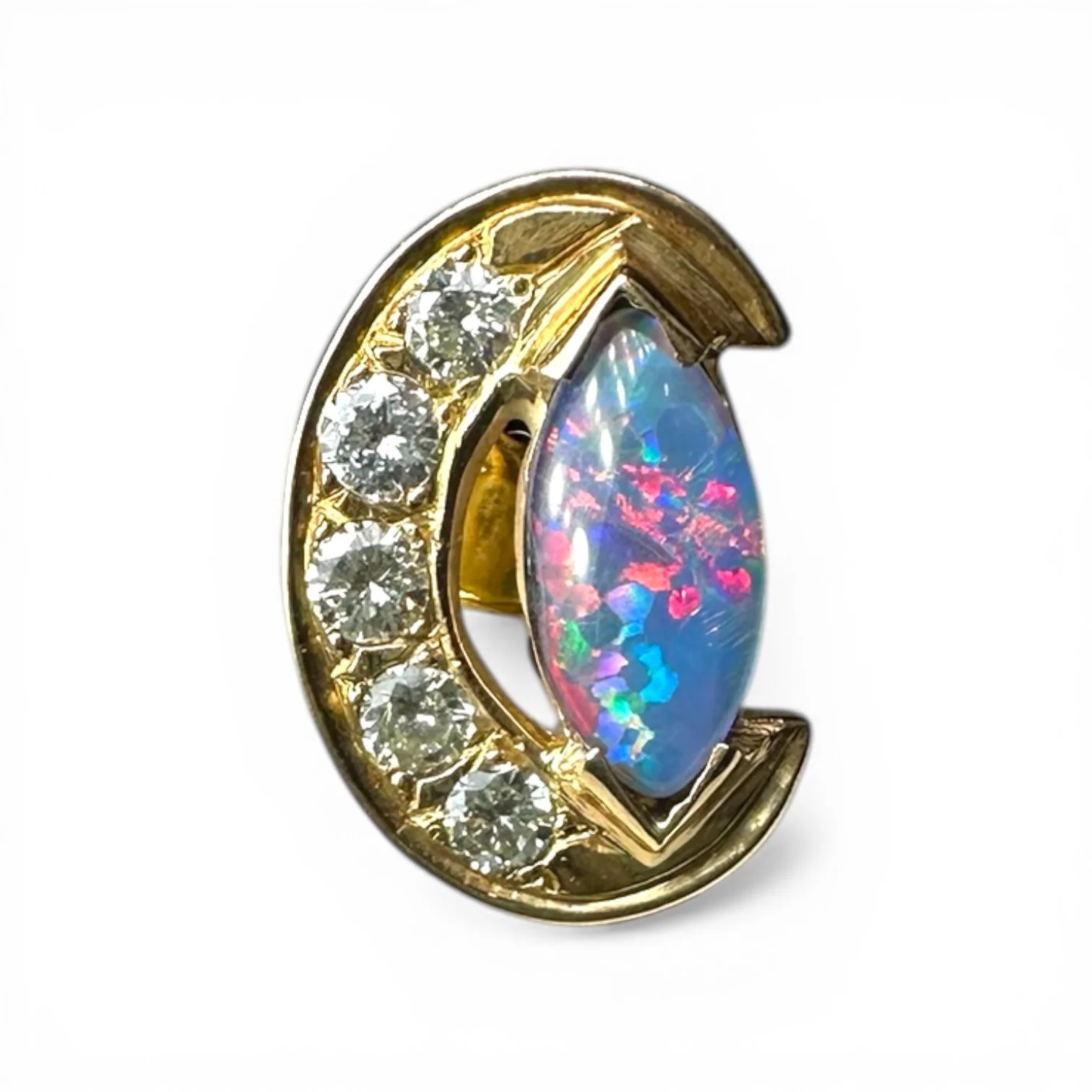A distinctive vintage pin crafted in 14 karat yellow gold, featuring a vivid opal triplet framed by natural diamonds in a sculptural crescent design.