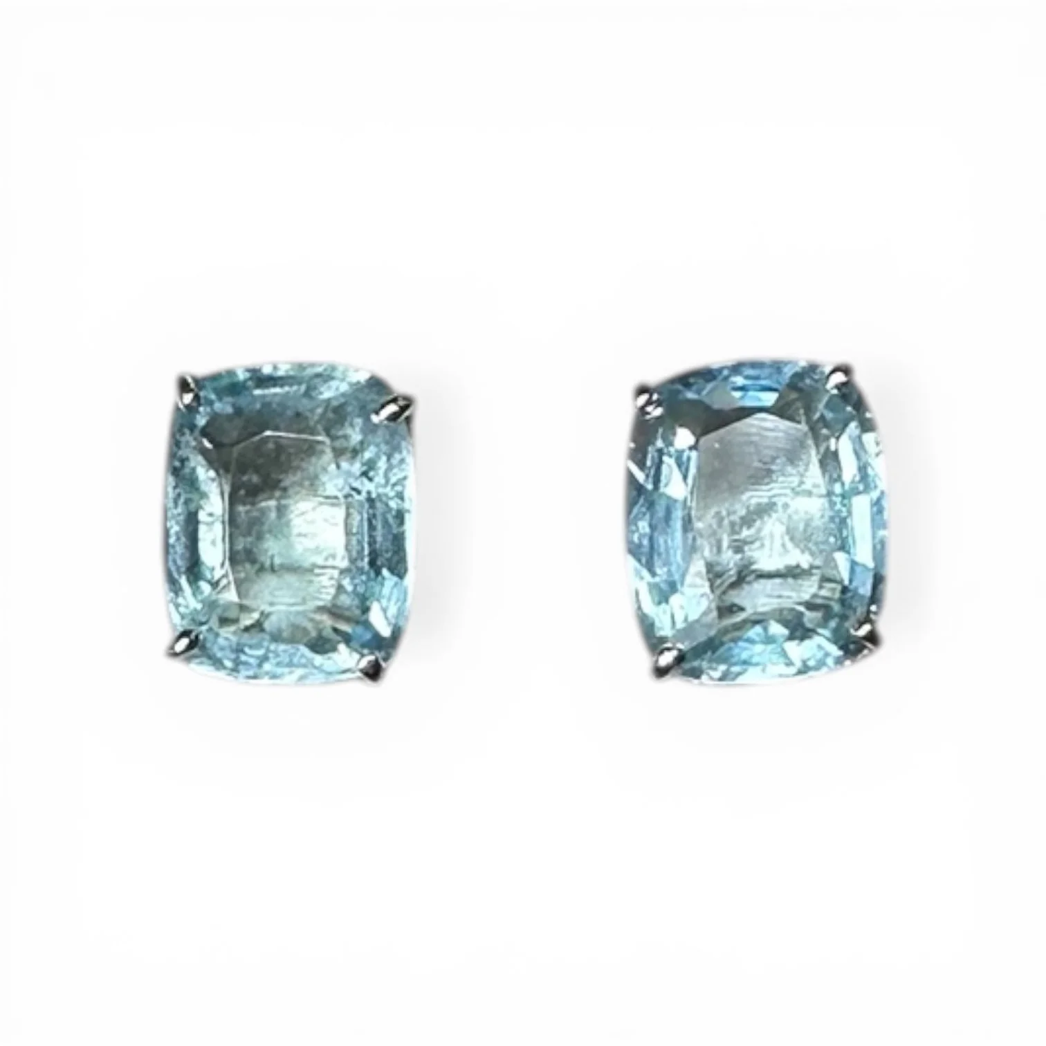 Each earring is set with a cushion-shaped aquamarine in a four-prong setting.