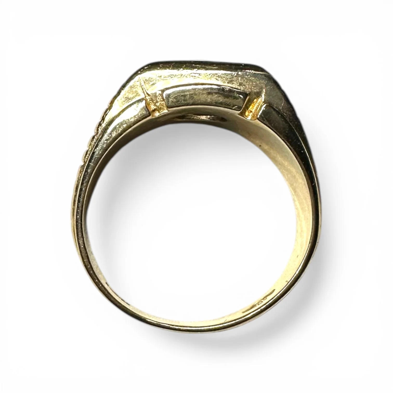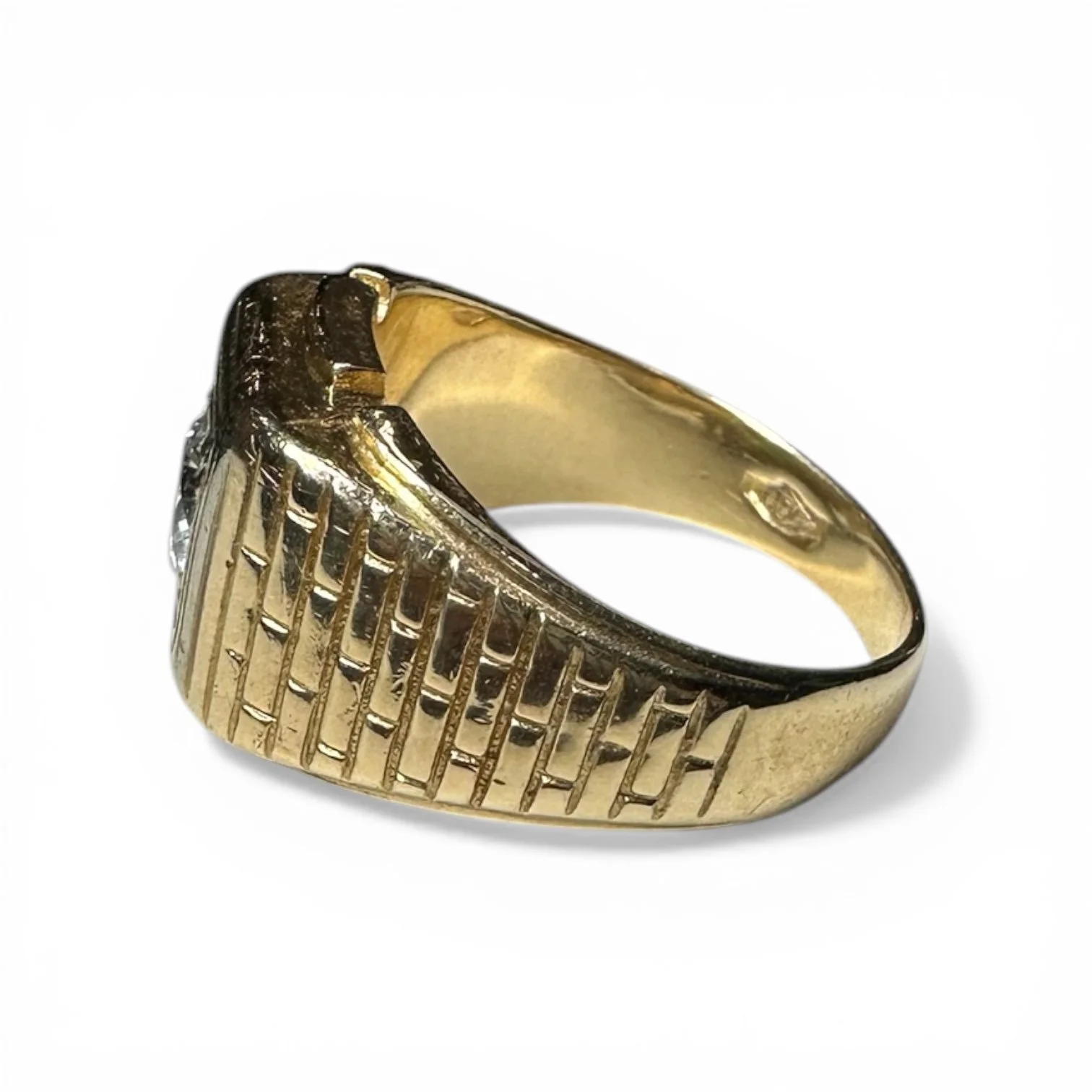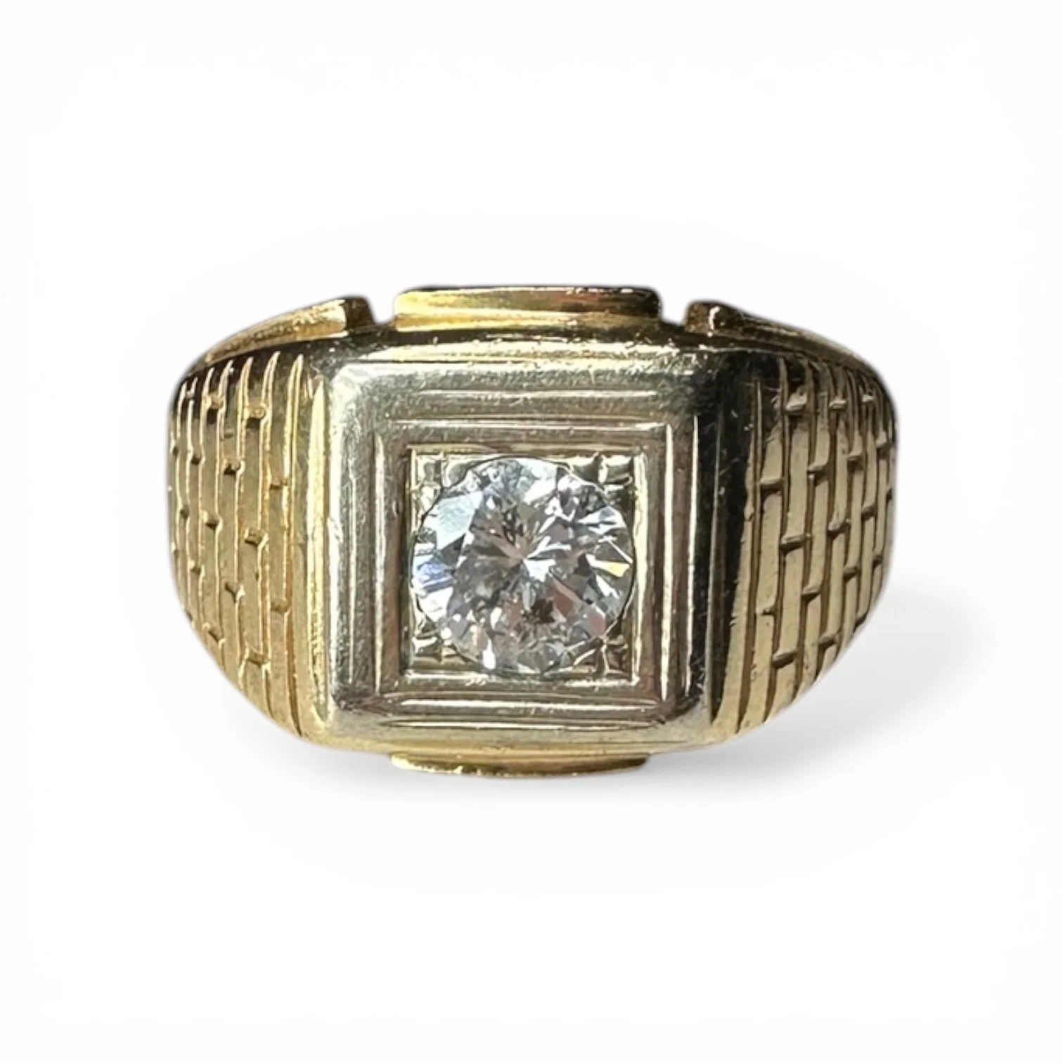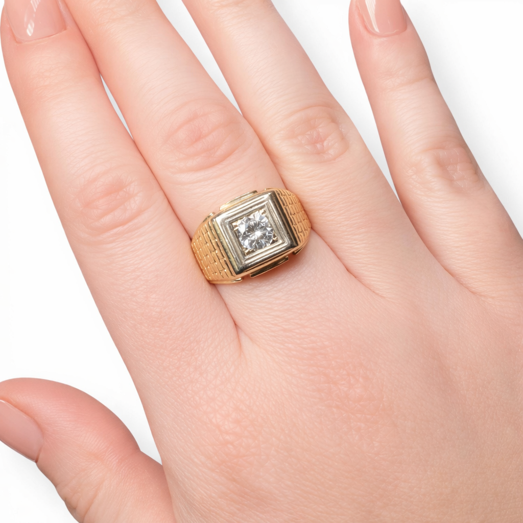 A classic vintage men’s ring crafted in 14 karat yellow gold, featuring a natural round brilliant diamond set within a squared, architectural head. The center stone is framed in 14 karat white gold, creating subtle contrast and enhancing the diamond’s brightness.