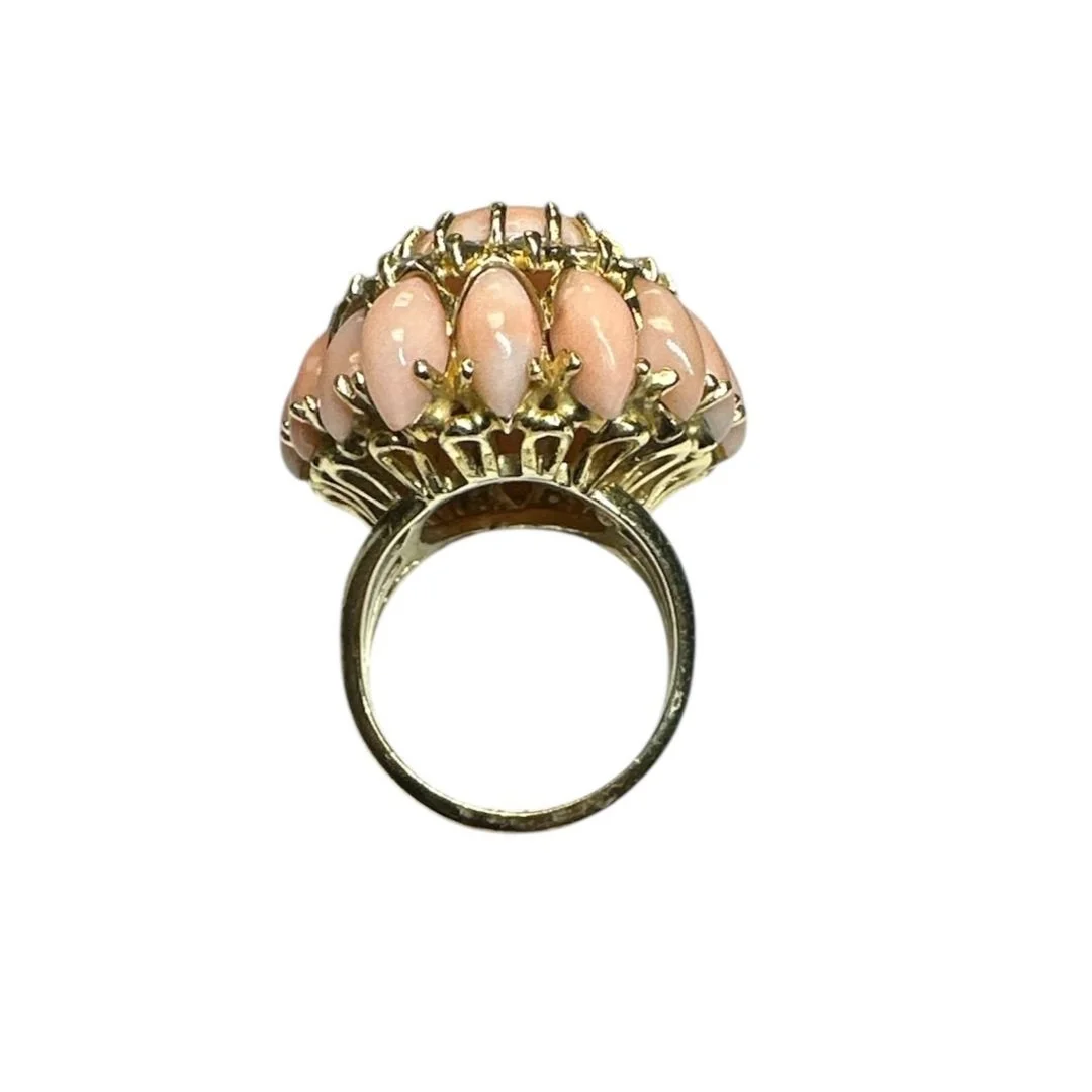 This bold and feminine vintage ring features an oval coral cabochon at its center, surrounded by marquise coral cabochons and glittering round brilliant diamonds. Crafted in 14K yellow gold with a split-shank design, this piece is both dramatic and elegant—a true statement ring with vintage charm.