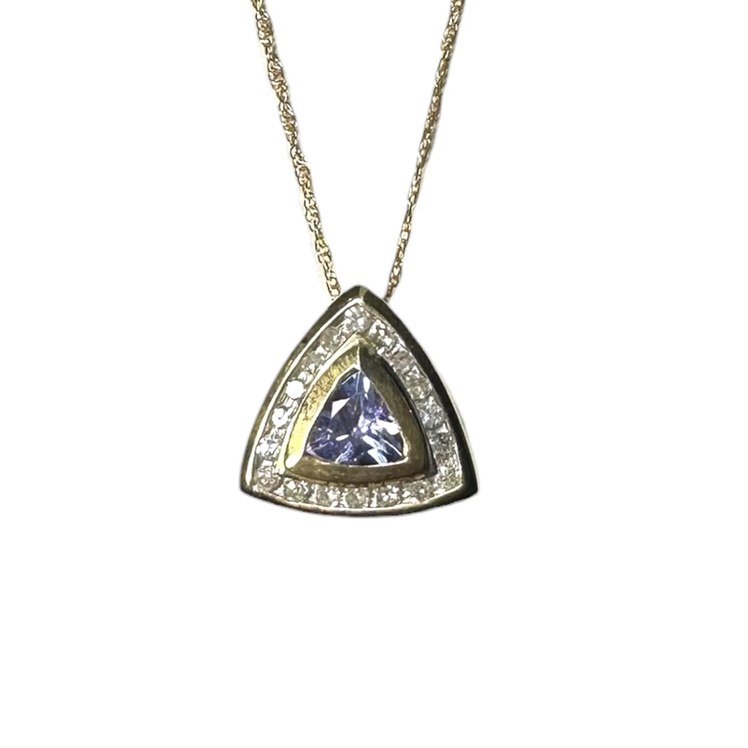 A pre-owned pendant necklace crafted in 14 karat yellow gold, featuring a richly colored trilliant-cut tanzanite framed by a delicate halo of natural diamonds.