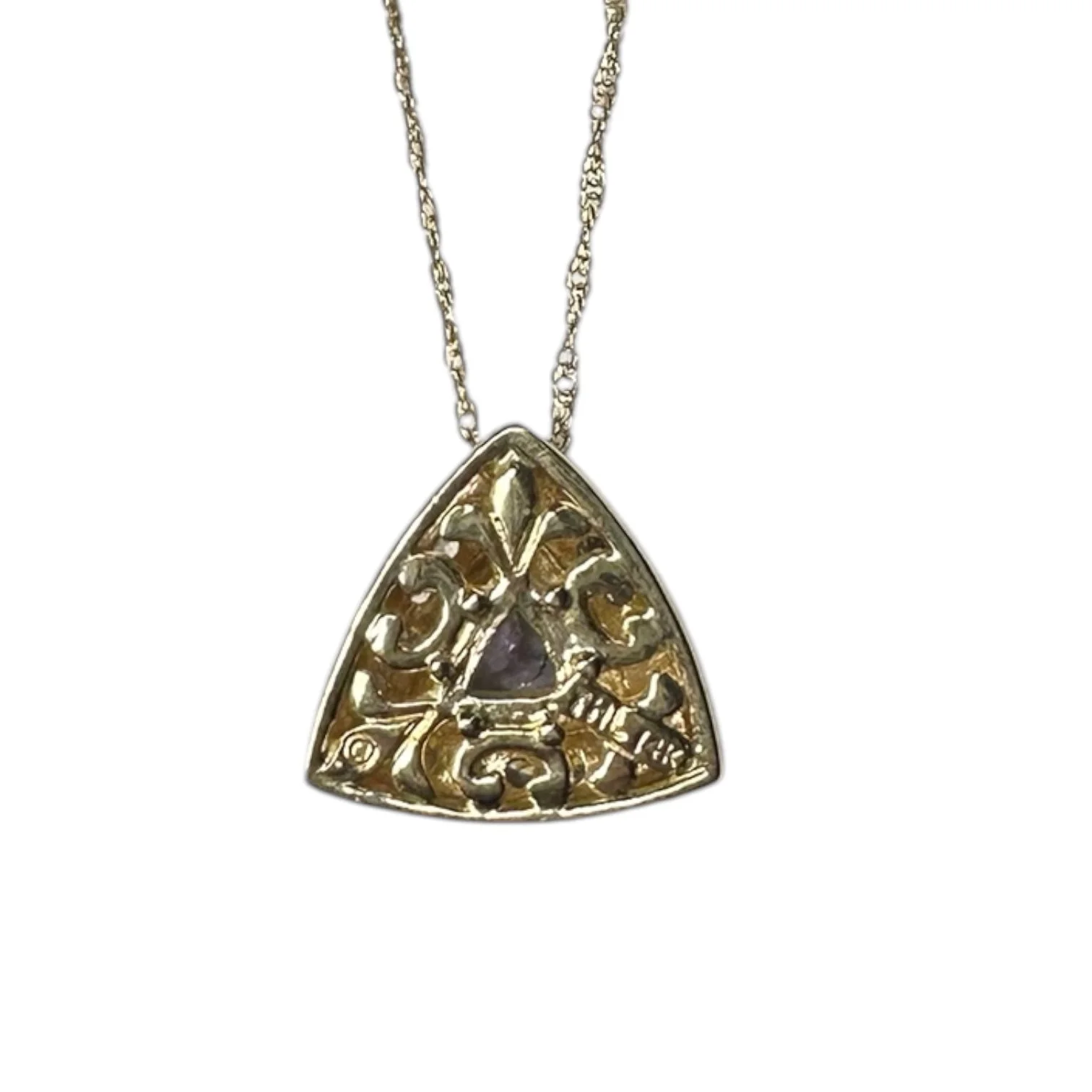 The reverse of the pendant features ornate openwork detailing, adding an element of craftsmanship and visual interest from every angle.