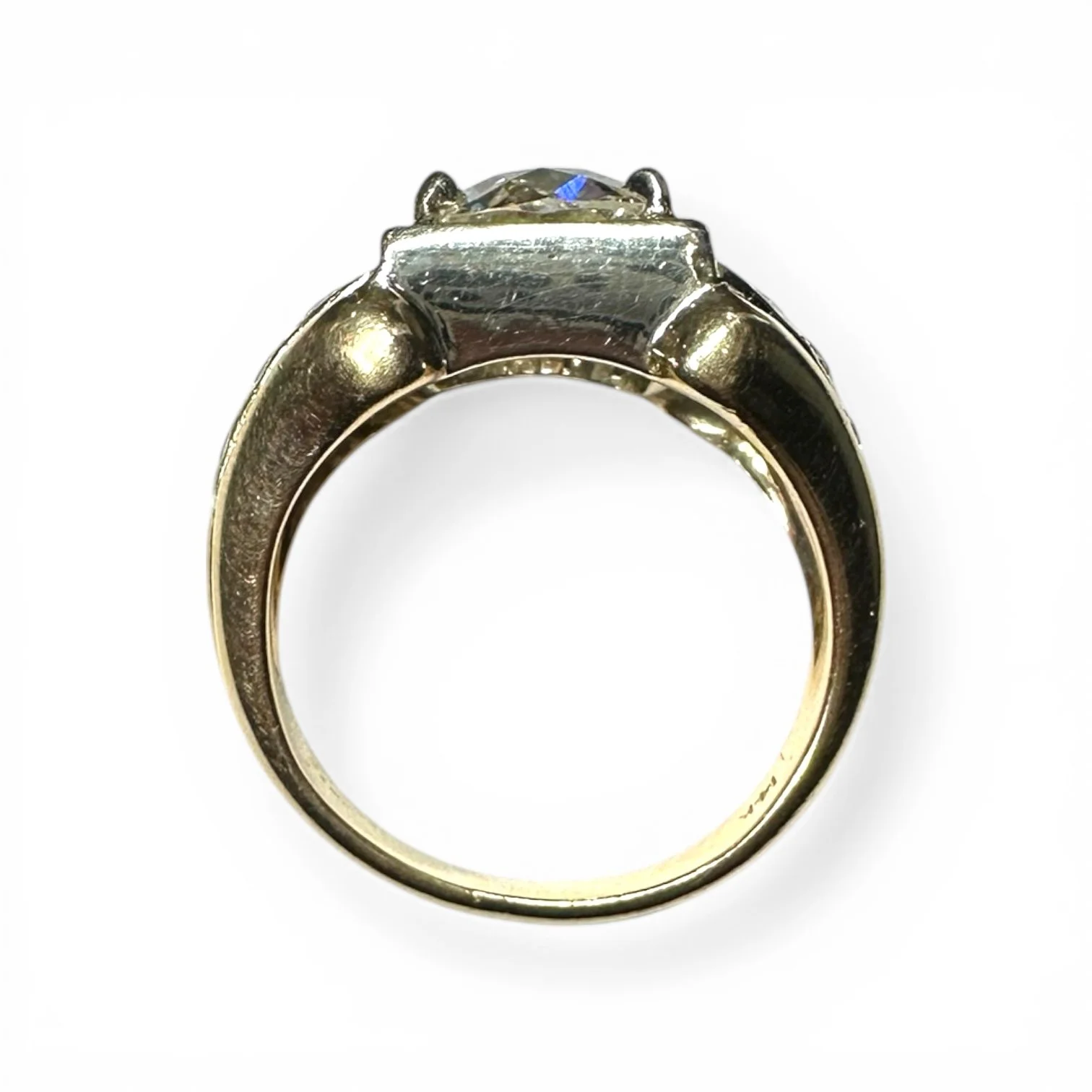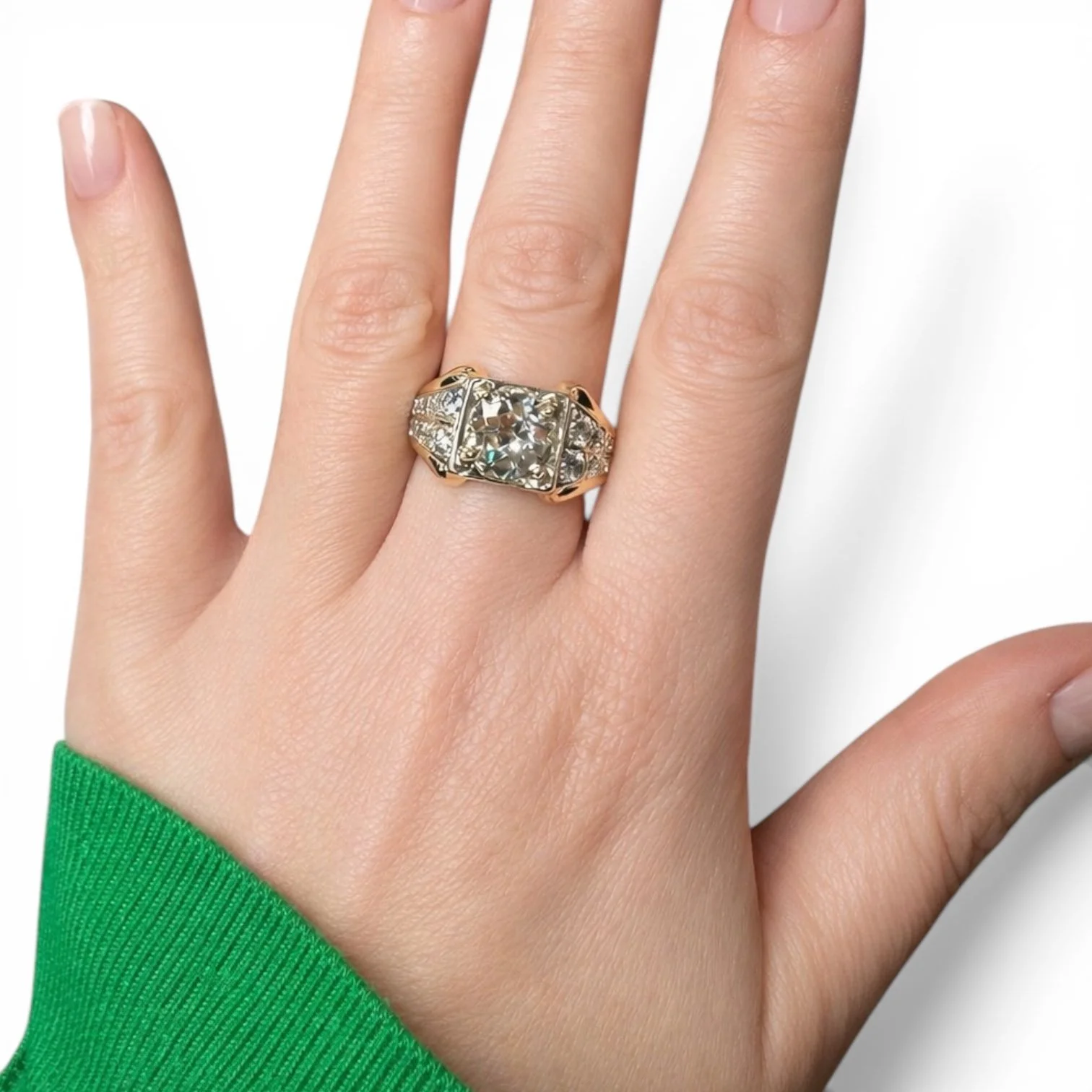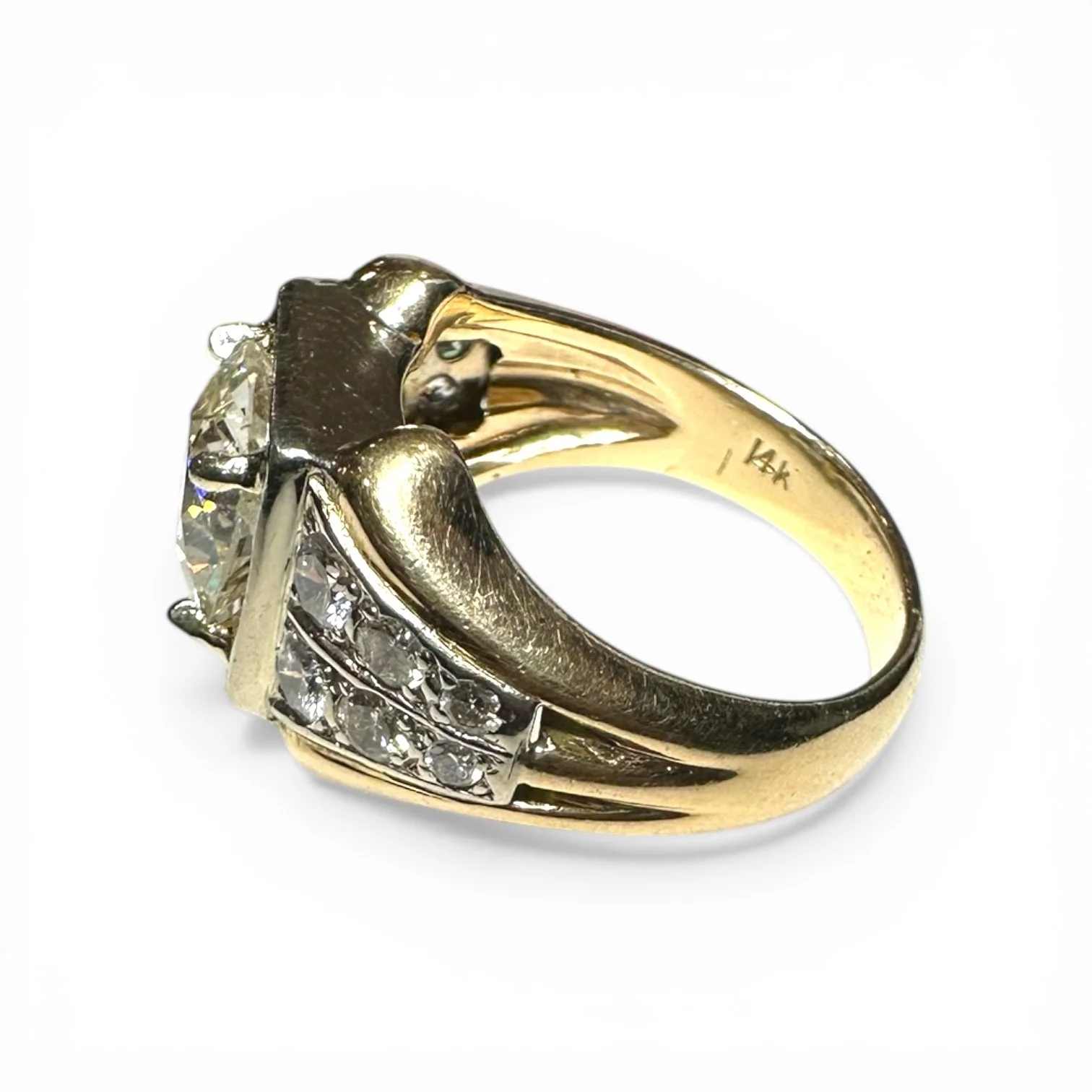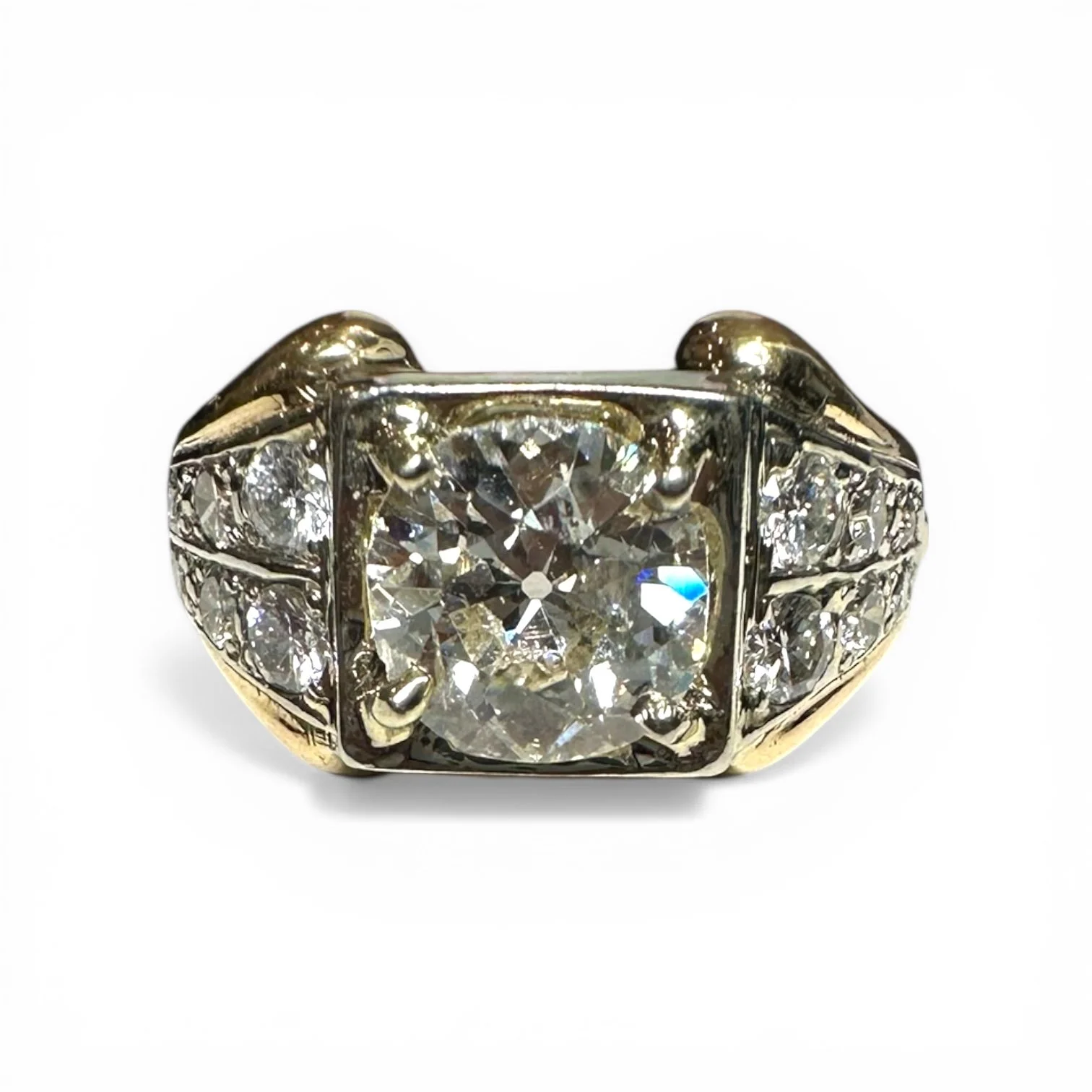 A substantial and beautifully crafted vintage diamond ring in 14K yellow and white gold, featuring a prominent old European cut diamond at its center. The central stone is framed in 14K white gold and accented by twelve brilliant cut diamonds along the shoulders, creating a strong, classic silhouette.