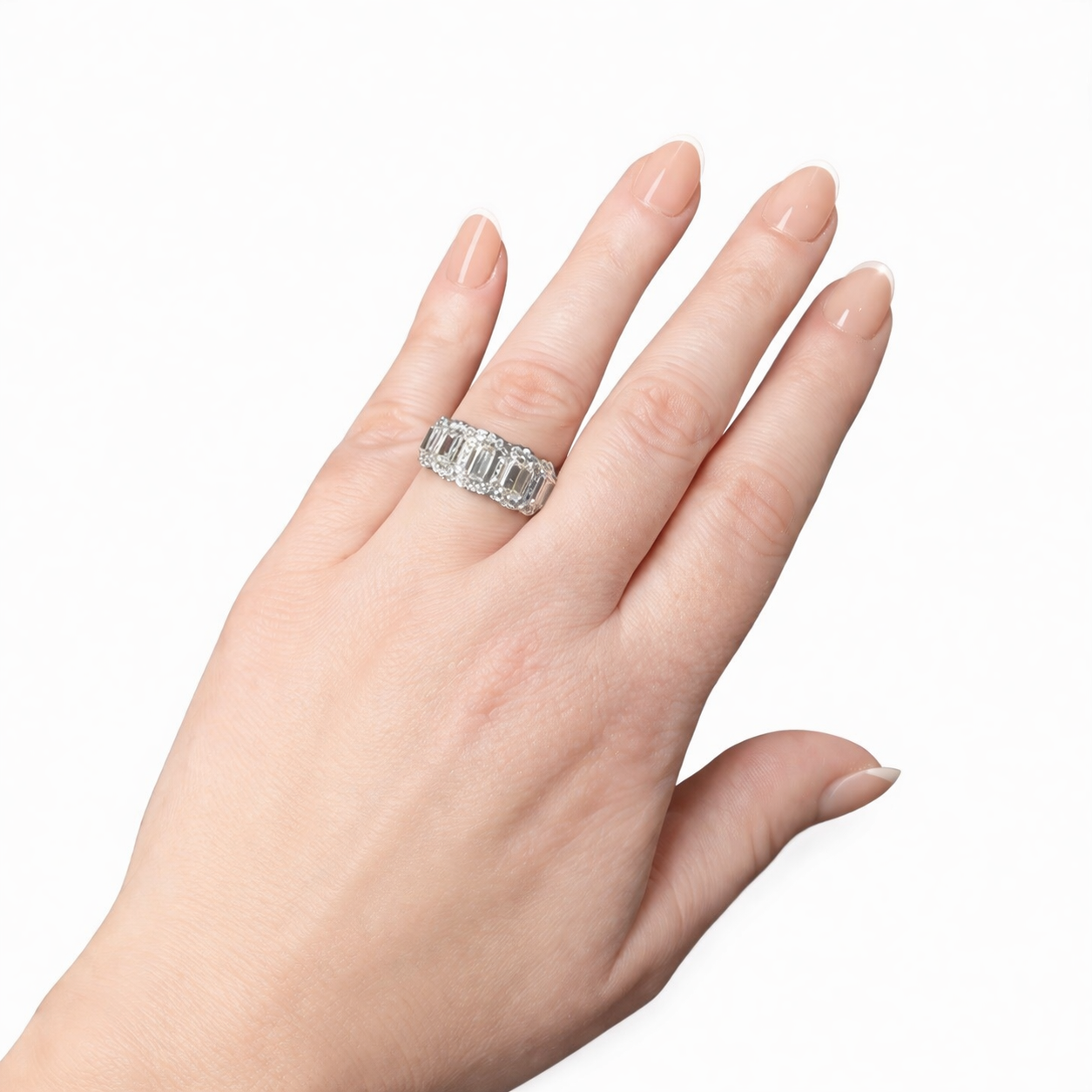 The ring features five L’Amour CrissCut diamonds, known for their elongated faceting and distinctive light performance, with an approximate total weight of 1.20 carats. These center stones are framed by natural round brilliant diamonds, adding depth and refined sparkle throughout the design.
