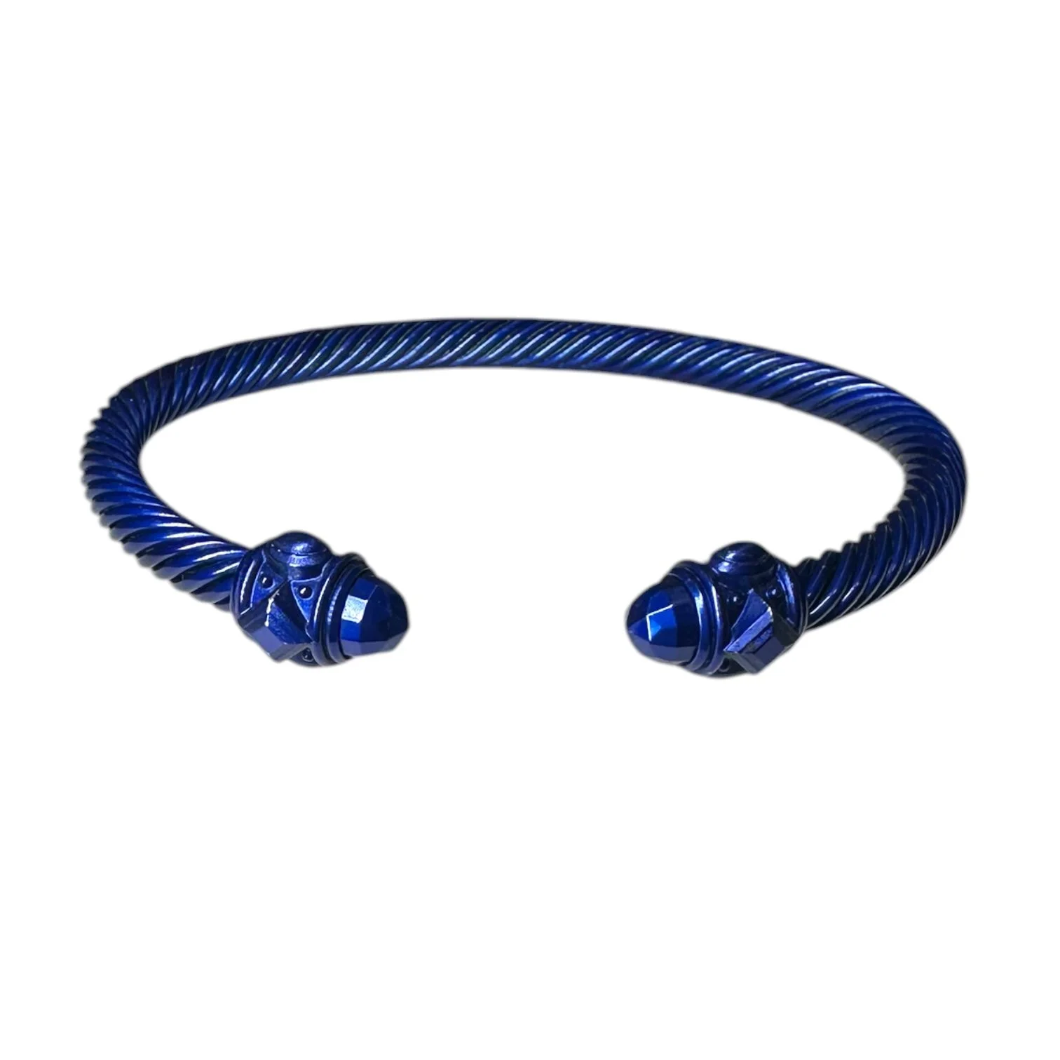 The bracelet features faceted end caps that enhance the sculptural silhouette, while the lightweight aluminum construction offers a comfortable, wearable feel with a bold visual presence. The deep cobalt blue finish adds a contemporary edge to a classic Yurman design.