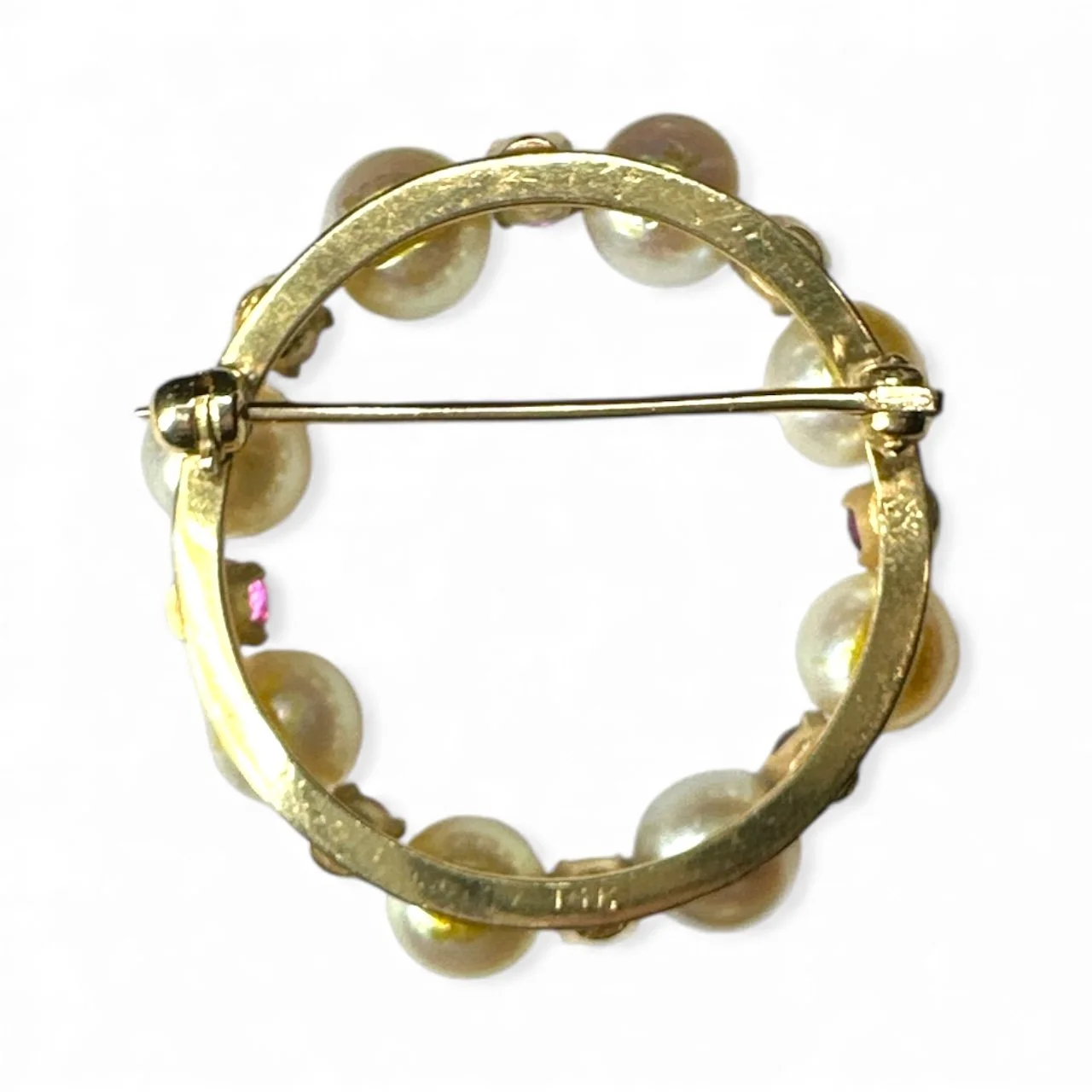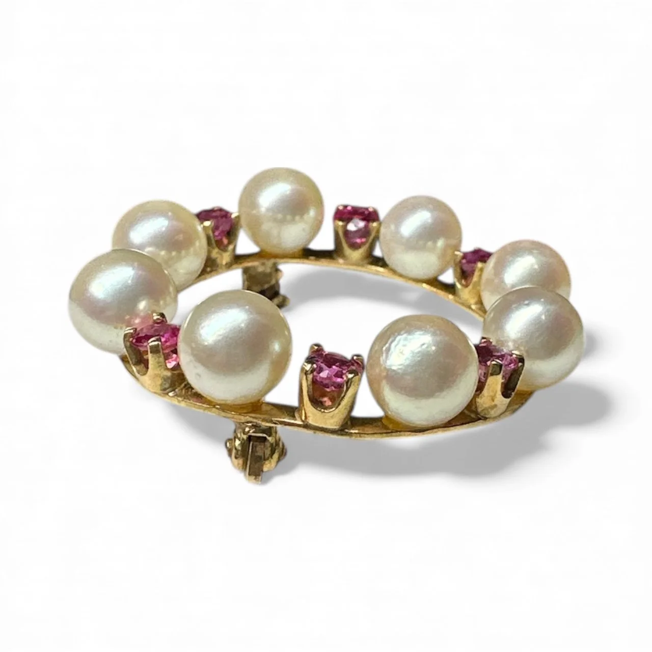 This elegant 14k gold circle brooch features a classic combination of cultured Akoya pearls and vivid pink sapphires. Alternating around the perimeter, the pearls measure approximately 6.00 mm and display a soft, luminous sheen, beautifully contrasted by bright pink sapphires that add a lively touch of color. The brooch weighs 5.7 grams and measures approximately 1.20 inches across, making it a timeless and versatile accent piece suited for jackets, dresses, scarves, or even as a modern pendant conversion. A graceful vintage treasure with enduring charm.